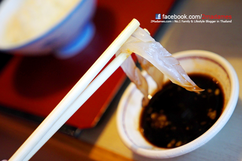 ปลาหมึกยังดิ้นได้อยู่เล็กน้อย มาลองชิมรสชาติของมันดีกว่า จิ้มน้ำจิ้มก่อน