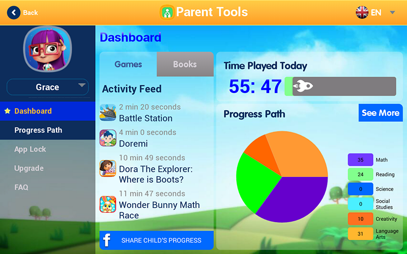Dashboard ของ Parent Tools จะแสดงว่าลูกเราเล่นเกมส์อะไรบ้าง เล่นไปกี่นาที แถมแยกหมวดคณิตศาสตร์, การอ่าน, วิทยาศาสตร์, ความคิดสร้างสรรค์ และภาษาต่างๆให้เรียบร้อย