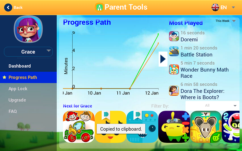 Progress Path แสดงผลด้วยว่าลูกเราสามารถเรียนรู้ผ่านการเล่นแอพได้ดีแค่ไหน และยังมีฟังก์ชั่นตั้งค่าแนะนำแอพที่เหมาะสมสำหรับลูกเราได้ด้วย