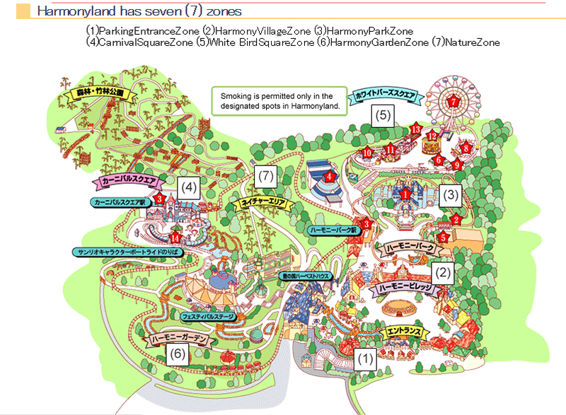 (1) Parking Entrance Zone (2) Harmony Village Zone (3) Harmony Park Zone (4) Carnival Square Zone (5) White Bird Square Zone (6) Harmony Garden Zone (7) Nature Zone