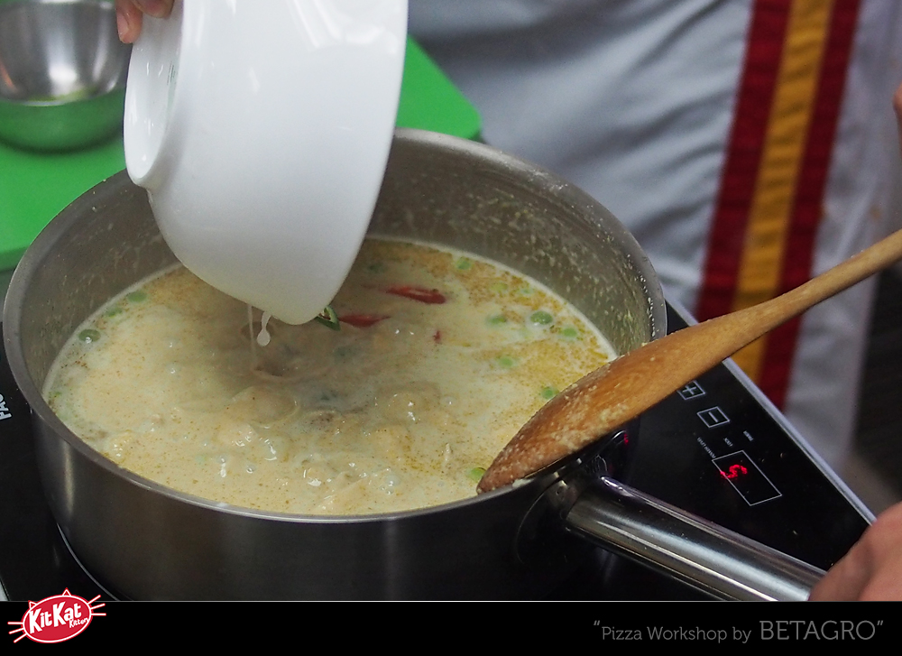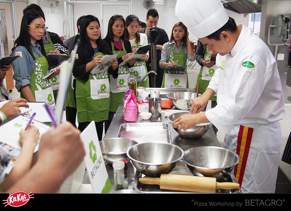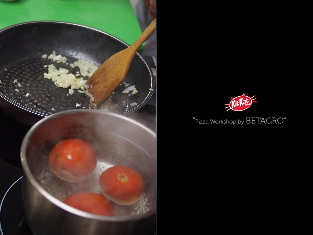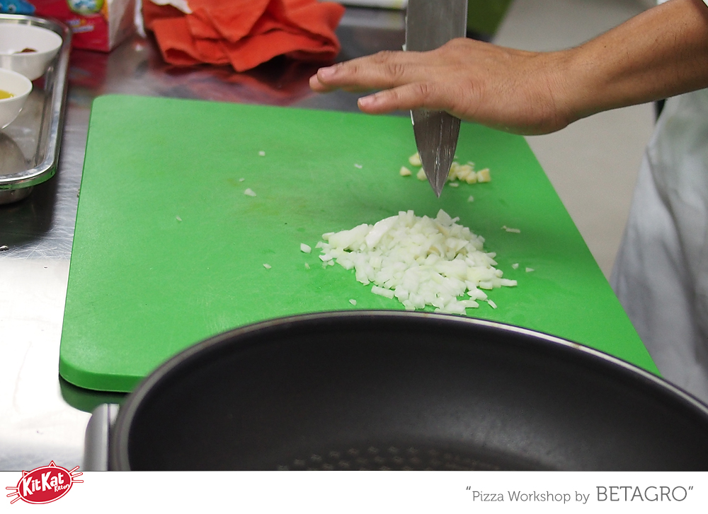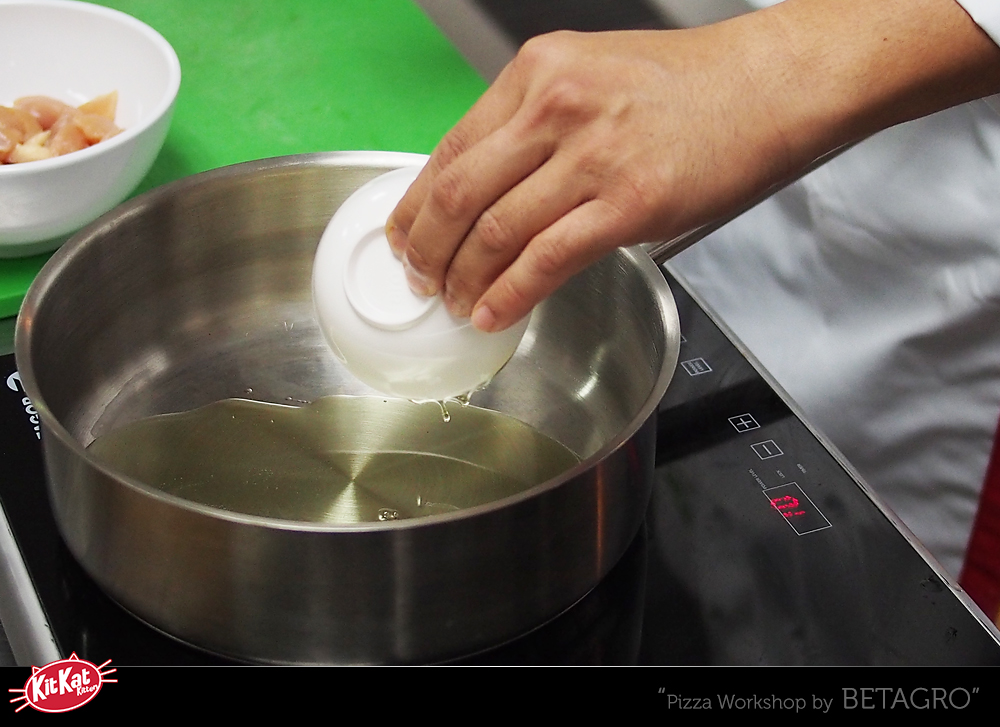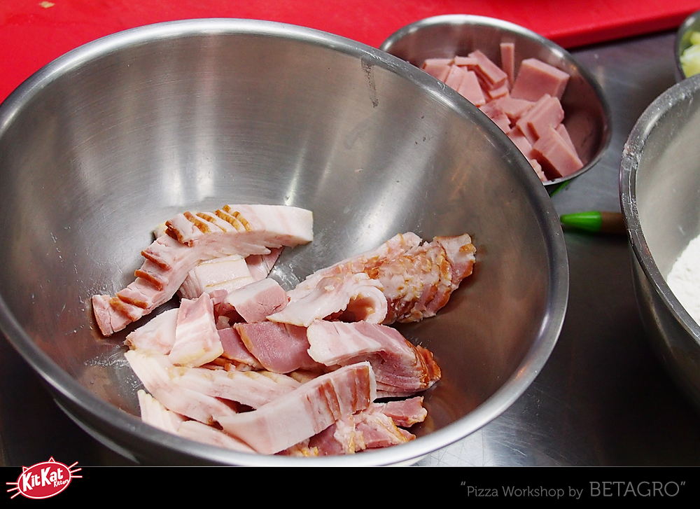 ขั้นตอนต่อไปเรามาทำหน้าพิซซ่ากันต่อค่ะ โดยเบทาโกรจะให้ผลิตภัณฑ์กันแบบไม่อั้นเพื่อให้เราใส่ลงไปที่หน้าพิซซ่าได้อย่างเต็มที่ โดยที่ในภาพ เชฟ กำลังสาธิตการทำหน้าพิซซ่าค่ะ วิธีการทำก็ผัด กระเทียม หอมใหญ่ แฮม และเบคอนเข้าด้วยกัน แล้วพักไว้ค่ะ ส่วนนี้จะเอาไว้ใส่บนหน้าพิซซ่า บน Tomato Concasse Sauce ที่เราทำพักไว้ขั้นตอนแรกค่ะ