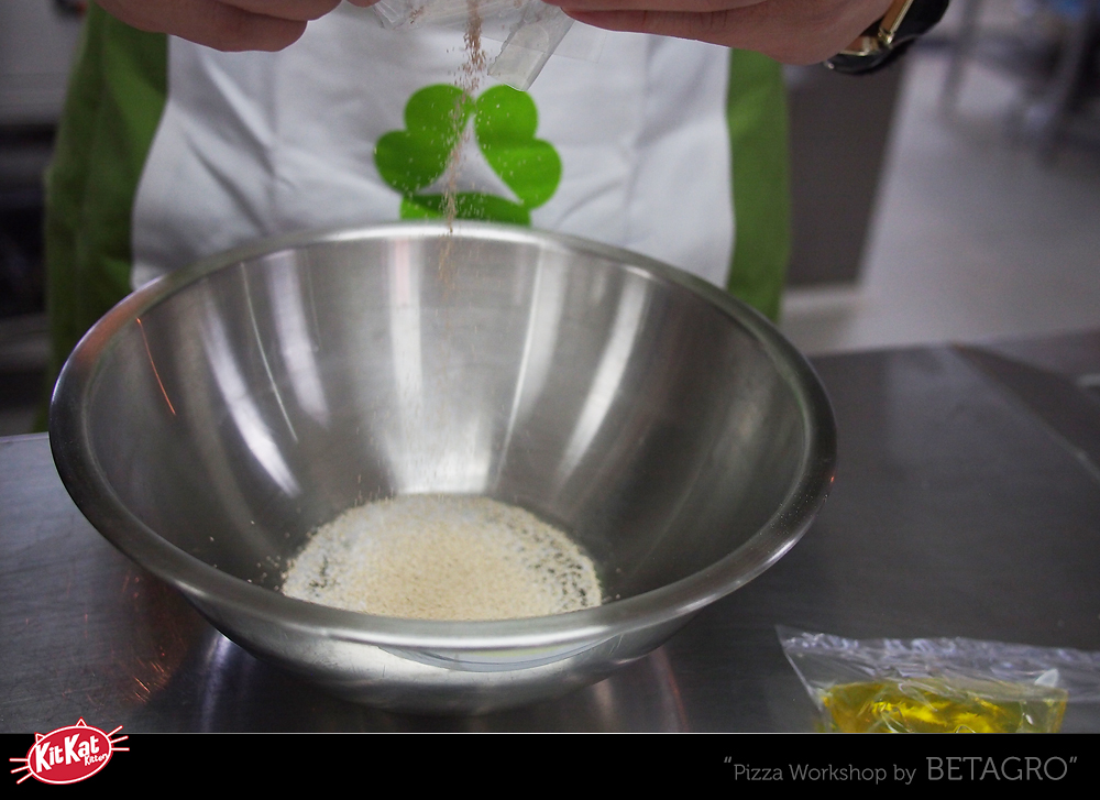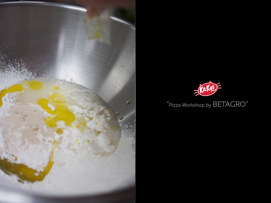 นำส่วนผสมของยีสต์ น้ำมันมะกอก และเกลือเพียงเล็กน้อยใส่ลงไปผสมลงในแป้ง ตะล่อมให้เข้ากัน