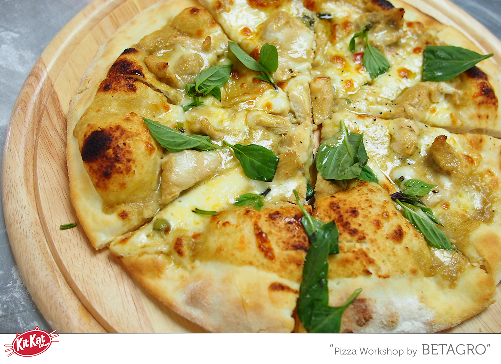 พิซซ่าหน้าแกงเขียวหวานรสชาติกลมกล่อมพร้อมเสริฟแล้วค่ะ