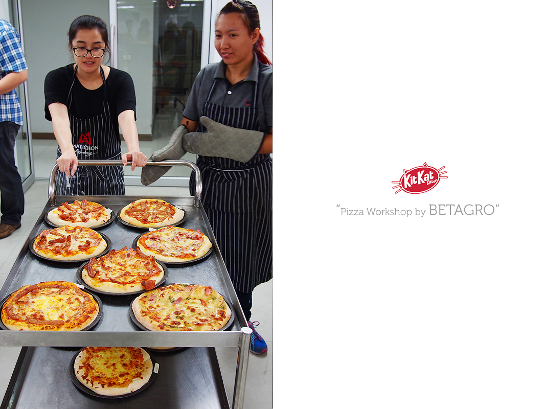 หลังจากอบเสร็จทางผู้ช่วยจะลำเลียงพิซซ่ามาให้เจ้าของผู้ร่วมกิจกรรมค่ะ