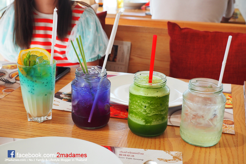 มา 4 คน ก็สั่งน้ำกันคนละสีเลย เครื่องดื่มที่ร้านเสวยมีความครีเอทดีมาก อย่างแก้วที่สองจากซ้ายมือ มองผิวเผินอาจคิดว่าเป็นน้ำอัญชันธรรมดา แต่เปล่าเลย แก้วนี้คือ “ตะไคร้อัญชันโซดา” รสชาติดีเลยครับ
