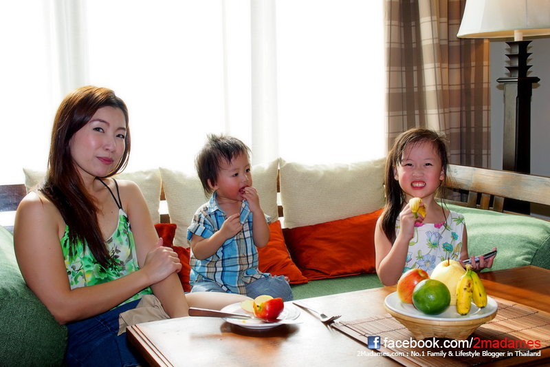เด็กๆวิ่งเล่นกันทั่วห้องจนเหงื่อแตก มานั่งพักทาน Welcome fruit กันอย่างสบายใจ