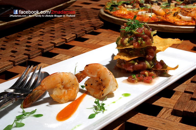ทูน่า ทาร์ทาร์ กับอะโวคาโด เสิร์ฟบนแผ่นเกี้ยวพร้อมกุ้งย่าง