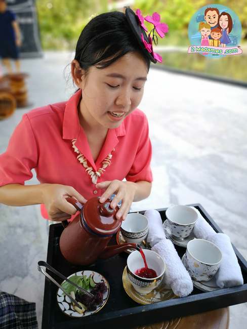 พนักงานนำ Welcome Drink มาต้อนรับ โดยจะเป็นเครื่องดื่มสมุนไพร หลักๆจะเป็นน้ำกระเจี๊ยบ เพิ่มตะไคร้ ใบกะเพรา