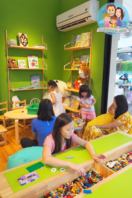 มุมตัวต่อเลโก้ ด้านหลังมีมุมนิทาน เด็กผู้หญิงเอาของเล่นมาตั้งเล่นเป็นร้านขายของ