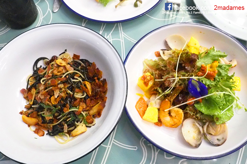 จานซ้ายเป็น Black and White Spaghetti Pancetta 220++ บาท เป็นการนำเอาเส้นสปาเก็ตตี้ดำและธรรมดามาผัดรวมกันกับวอลนัท และเบคอน รสชาติผัดพริกกระเทียม แต่รสไม่จัดนะ เด็กๆทานได้ น้องกายนี่ชอบเลย