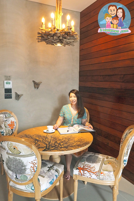 มีโต๊ะอาหารด้วยนะ โต๊ะทำจากไม้ตามคอนเซปท์ยังไม่พอ มีเพ้นท์ลวดลายกิ่งไม้เข้าไปอีก
