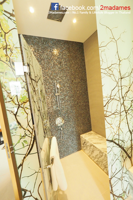 ส่วนห้องขับถ่ายและห้องอาบน้ำจะกั้นด้วยกระจกลายต้นไม้สวยไปอีกแบบ Rain Shower ที่นี่สูงมาก อาบน้ำมันส์ดีครับ