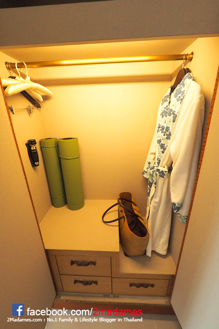 ของใช้ในตู้เสื้อผ้าก็มีชุดคลุมอาบน้ำ กระเป๋าไว้ใส่ของไปชายหาดหรือสระว่ายน้ำ มียันเสื่อโยคะเลย