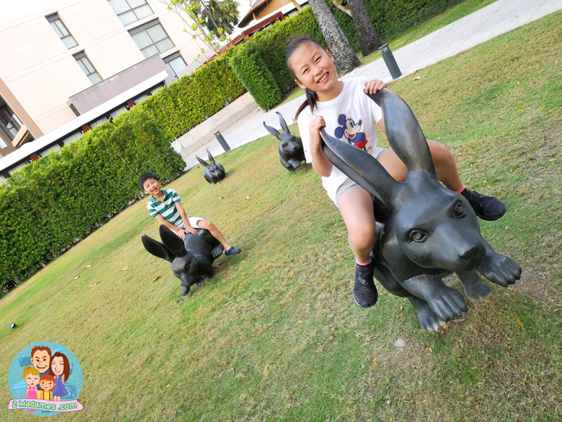 แวะมาทักทายเจ้ากระต่าย “สุขสบาย” ถือนาฬิกาที่คุ้นเคยบริเวณทางเข้าตัวรีสอร์ท