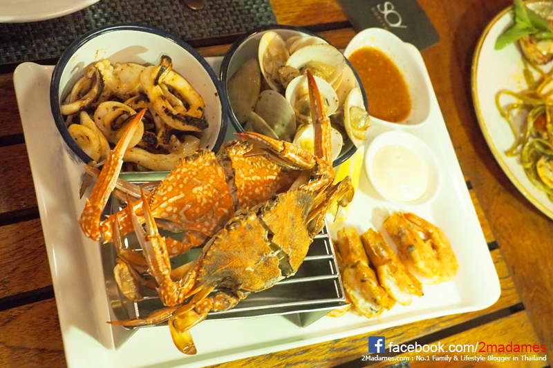 สำหรับเมนูถัดมา Seafood Platter BBQ 1,250++ บาท จะเป็นเมนูพิเศษที่มีเฉพาะวันศุกร์และวันเสาร์ เรียกว่าเป็นเมนูยกทะเลขึ้นบกมาเลย มีทั้งกุ้ง ปูม้า หอยตลับ และปลาหมึก ขอชื่นชมในความสดของวัตถุดิบ แม้ปูม้าจะตัวไม่ใหญ่ แต่เนื้อหวานมากกก