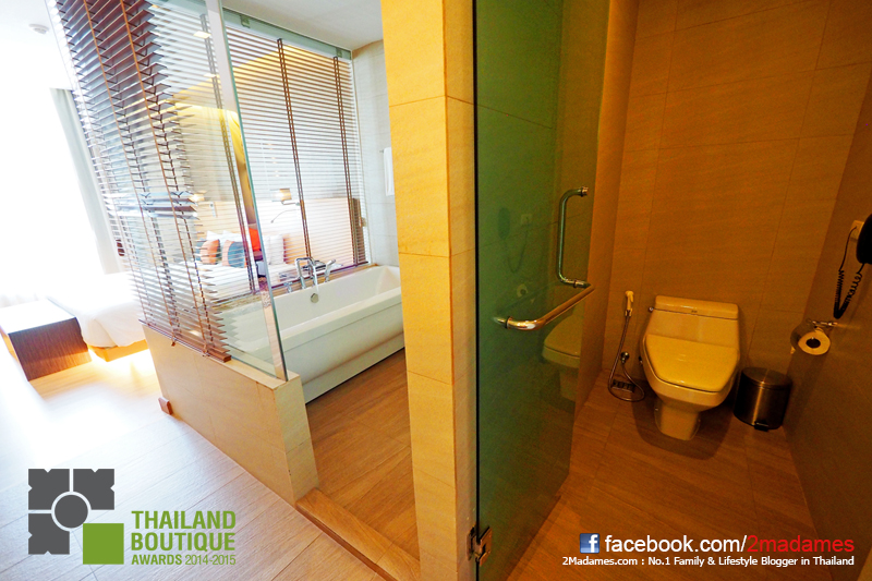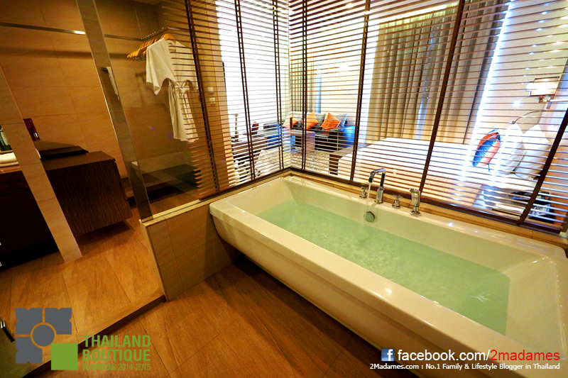 มีอ่างน้ำขนาดใหญ่ ไซส์รองรับฝรั่งตัวใหญ่ๆได้สบายเลย ผนังใช้กระจกทำให้ไม่รู้สึกอึดอัด