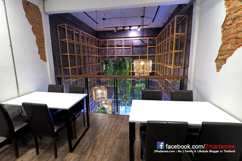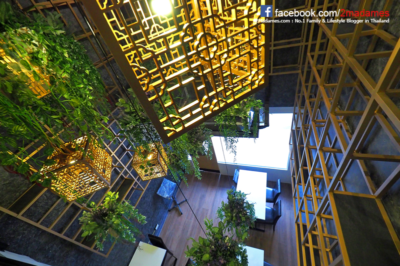 เข้ามาในร้านก็จะเจอกับบรรยากาศสบายๆ มีโถงสูงที่ห้อยโคมไฟและต้นไม้อยู่
