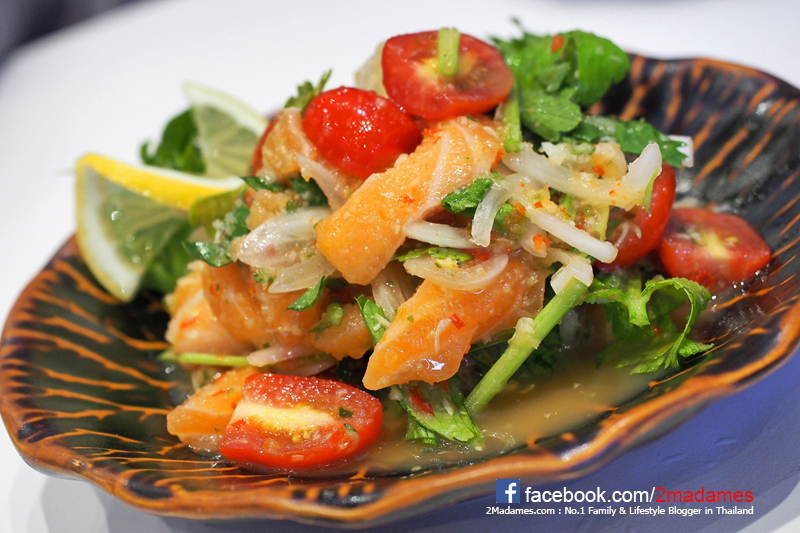 นั่งรอไม่นานอาหารที่เราสั่งก็ทยอยๆกันมา เริ่มต้นด้วย “ยำแซ่บแซลมอนซี้ด” เพื่อเรียกน้ำย่อยกันก่อนเลย ราคา 179 บาท ที่ร้านกะระคุเค้าใช้แซลมอนเกรดเดียวกับที่ใช้ทำซาซิมิ เพราะฉะนั้นเรื่องความสดไม่ต้องพูดถึง แซลมอนหั่นชิ้นพอดีคำไม่บางจนเกินไป คลุกเคล้าผักสดๆและน้ำยำรสชาติจี๊ด ถ้าใครชอบทานแซ่บๆรับรองถูกใจแน่นอน