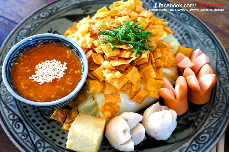 เริ่มกันด้วยเมนูที่ชื่อเก๋ไก๋อย่าง ข้าวพันผักสุกี้ไฮโซ เป็นข้าวพันห่อผัก และใส่เครื่องเคียงเป็นไส้กรอก ลูกชิ้นหมู เต้าหู้ปลาและเกี๊ยวกรอบ ทานคู่น้ำจิ้มสุกี้รสเข้มข้น เสียดายนิดๆน่าจะมีกากหมูเจียวราดมาด้วยน่าจะอร่อยกว่านี้อีกเยอะเลย