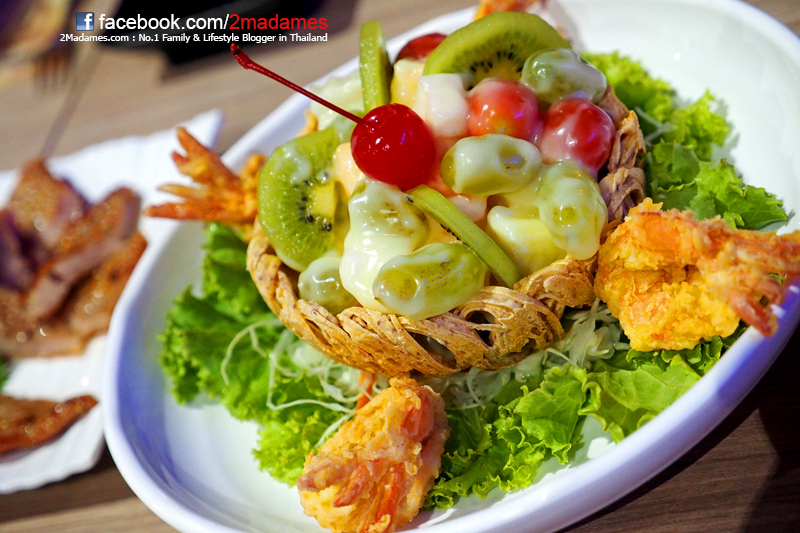 กุ้งสลัดผลไม้ ราคา 350 บาท จานนี้ภรรยาผมเป็นคนสั่งบอกว่าจะลดความอ้วน แต่เธอก็กินอย่างอื่นแทบทุกจาน ท่าทางน้ำหนักจะลดไปเยอะน่าดูเลย 555