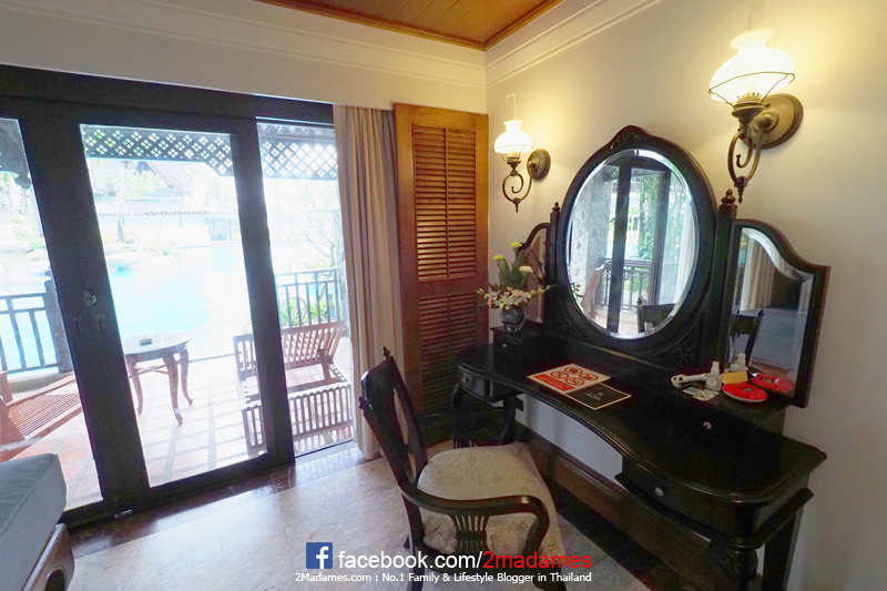 มีโต๊ะเครื่องแป้งสวยๆอยู่ใกล้กับระเบียงห้องพัก