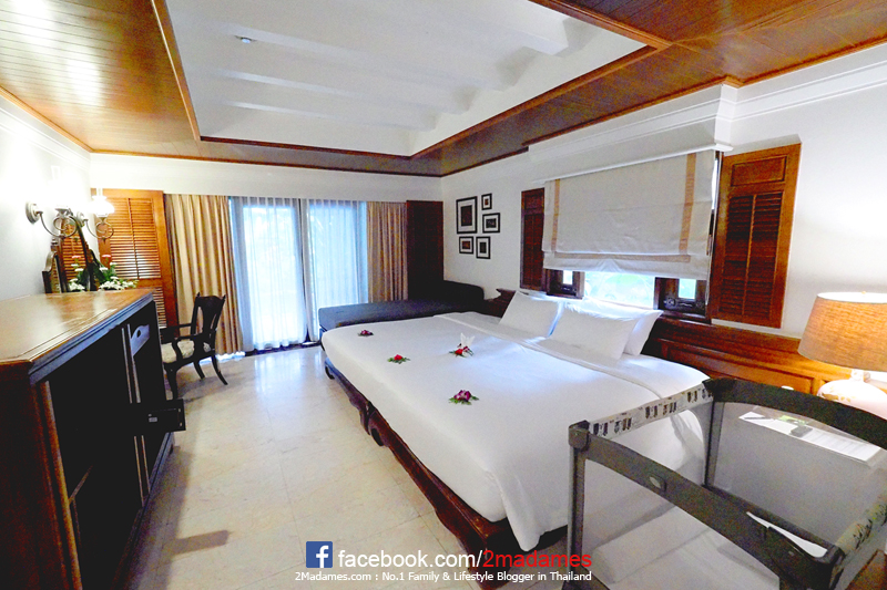 ครอบครัวเราเปิด 2 ห้องเชื่อมกันเป็น Connecting Room ด้านนี้ของพ่อแม่เลยเป็นเตียงใหญ่ เสริมเตียงเด็กน้อยให้เบบี้เกล็น 1 เตียง