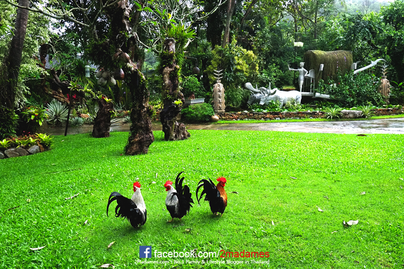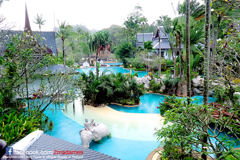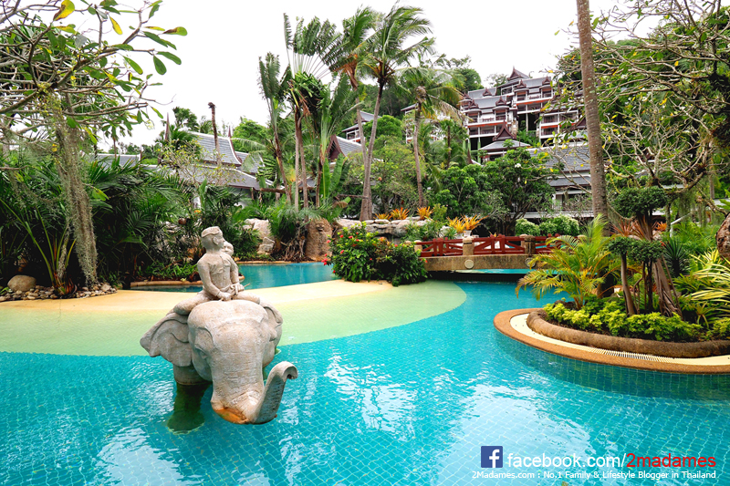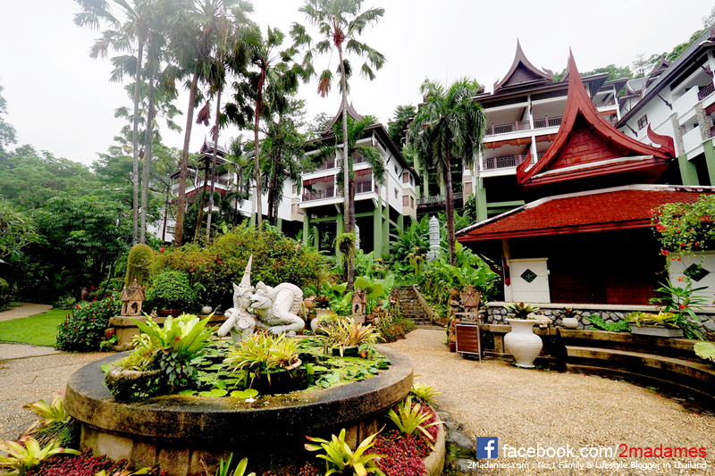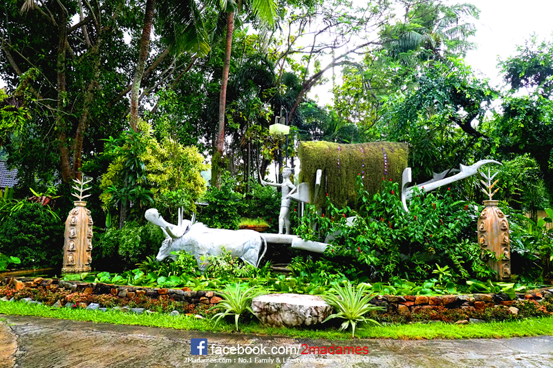 แต่ตัวรีสอร์ทกลับถูกปกคลุมด้วยต้นไม้สีเขียวเยอะมาก สลับกับ Sculpture แนวไทยๆ