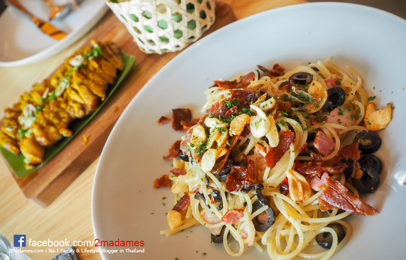 ชมบรรยากาศรอบๆพอหอมปากหอมคอละ สั่งอาหารไม่นานมาก อาหารก็ทยอยมาเสิร์ฟ เริ่มต้นจานแรกกันด้วย Bacon Garlic & Chilli Spaghetti สปาเก็ตตี้เบคอนผัดพริกแห้ง เป็นเมนูโปรดของคุณนายผมเลย ผัดรสชาติมาได้จัดจ้านใส่เครื่องมาแบบไม่ยั้งโดยเฉพาะมะกอกดำ เคี้ยวกันเพลินเลย