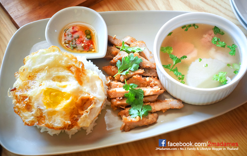 ข้าวหมูกระเทียมไข่ดาว พร้อมน้ำซุปให้ซดคล่องคอ คืออาหารไทยที่นี่อร่อยมาก แม้จะเป็นเมนูธรรมดาๆ แต่เสิร์ฟแบบจัดมาเป็นเซ็ต เลยอัพราคาขายได้เลย