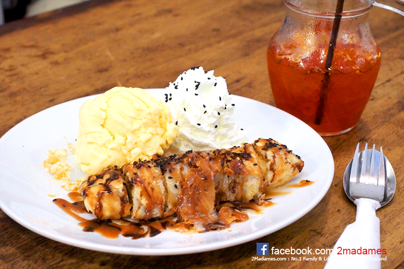 โรตีกรอบ 225 บาท ราคาแอบสูงนะ เป็นโรตีสอดไส้กล้วยไปทอดกรอบๆ ราดช็อคโกแลตและคาราเมล มีโรยงาด้วย ทานกับไอศกรีมวานิลลาและวิปครีม ส่วนตัวผมว่ามันหลายรสชาติมากไปหมด ตีกันไปหมด ความอร่อยเลยหายไปเลย 555