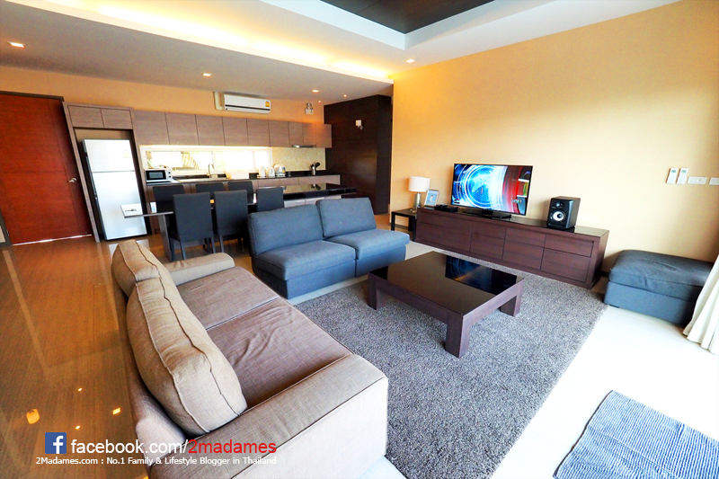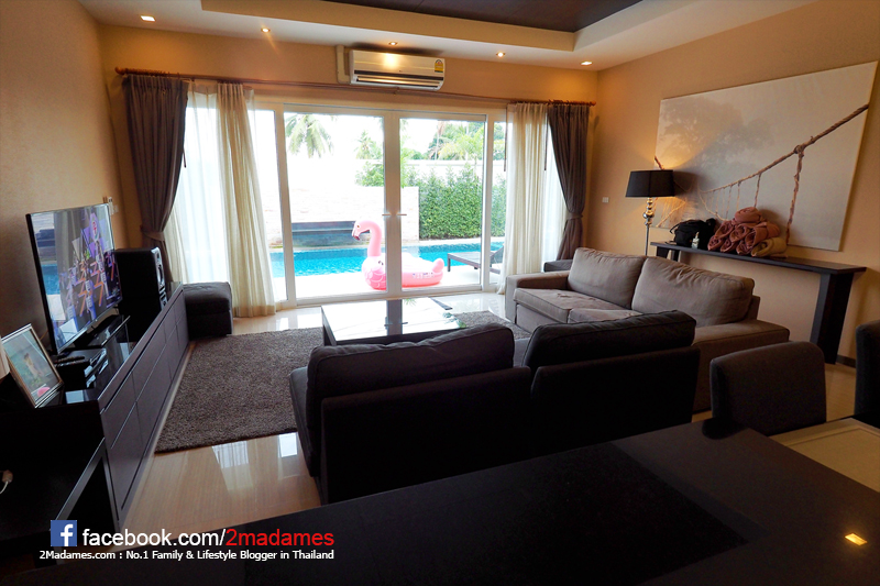 ข้อดีของบ้านแบบนี้ คือ ปกติถ้าครอบครัวใหญ่ไปเช่าโรงแรม เราก็จะได้เป็นห้องสี่เหลี่ยมหลายๆห้องที่ไม่มีพื้นที่ส่วนกลางให้ทำกิจกรรมร่วมกันเนอะ แต่บ้านพูลวิลล่าแบบนี้เราจะมีทั้งห้องนอน และห้องนั่งเล่นมาสังสรรค์กันได้แบบสบายๆ