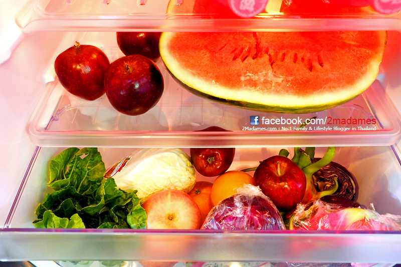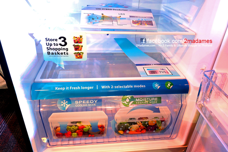 ลิ้นชักด้านล่างมีให้เลือกสองโหมดนะ คือแบบ Speedy Cooling (แบบลมเข้าปกติ) หรือแบบ Moisture Keeping แบบหลังจะใช้ความเย็นรอบๆ แต่ไม่มีลมเข้าไป ทำให้ผักผลไม้เก็บได้นานยิ่งขึ้น