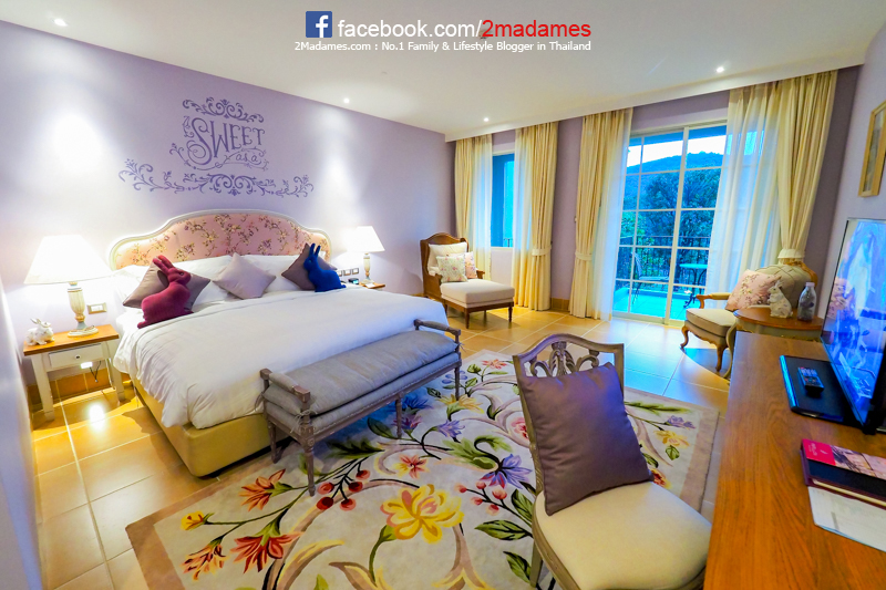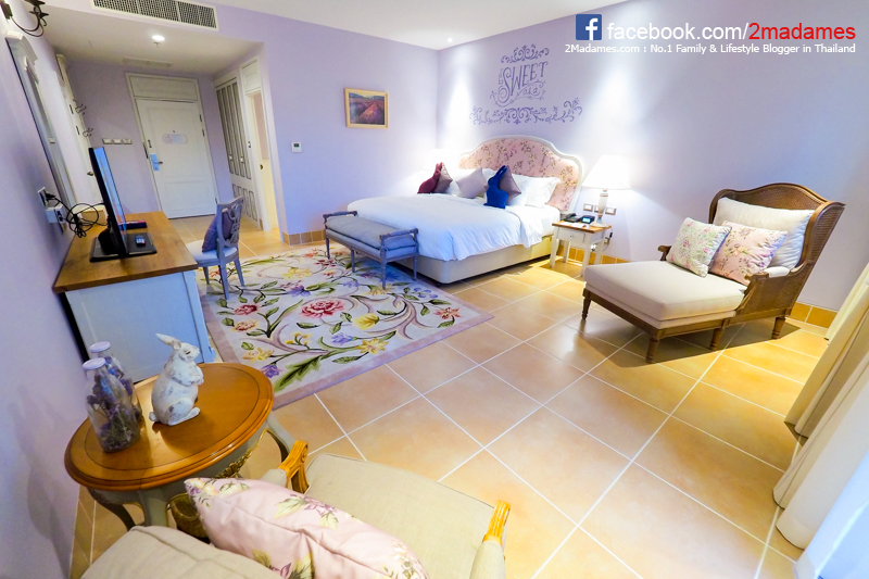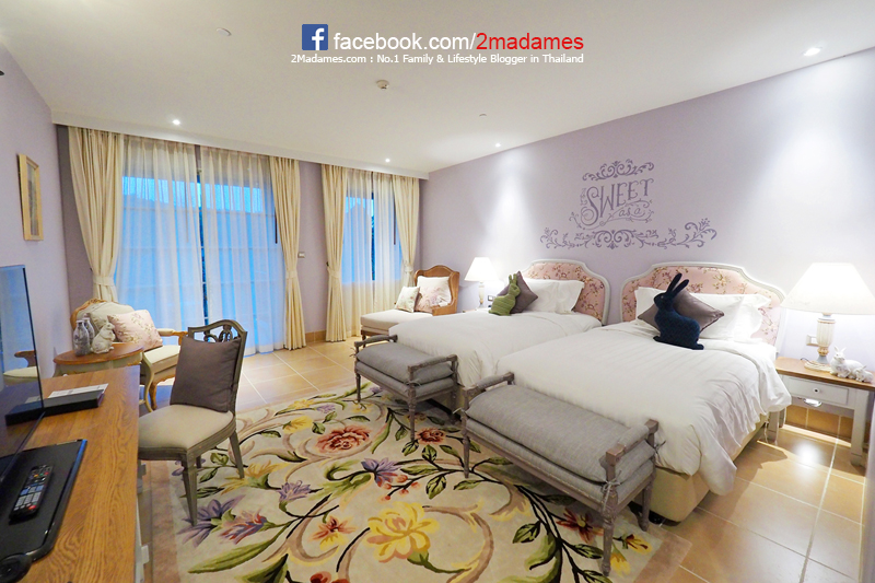 เรามาชมห้องพักแบบดีลักซ์กันก่อนเนอะ เปิดเข้าห้องมา โอ้โห ห้องน่ารักหวานแหววมากมาย ผนังสีม่วงลาเวนเดอร์ให้ความรู้สึกเหมือนห้องนอนเจ้าหญิงในนิทานเลย ตัวห้องก็กว้างขวางไม่อึดอัด ตกแต่งประดับประดาด้วยเจ้ากระต่ายตัวน้อยเต็มไปหมด