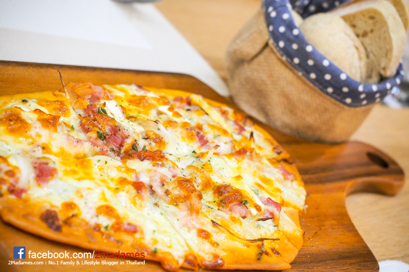 ลองสั่ง Signature Dish มาทานกันดูจ้า จานแรกเป็น Tarte Flambee ราคา 250++ ทาร์ตฟล็องเบ หน้าตาคล้ายพิซซาแต่ตัวแป้งออกแห้งกรุบกรอบ โรยหน้ามาด้วยเบคอนฝรั่งเศสและทาร์ตหัวหอม ขอบอกว่าเป็นเมนูที่อร่อยมาก เด็กๆถูกใจกันใหญ่ ทานกันเพลินทีเดียว
