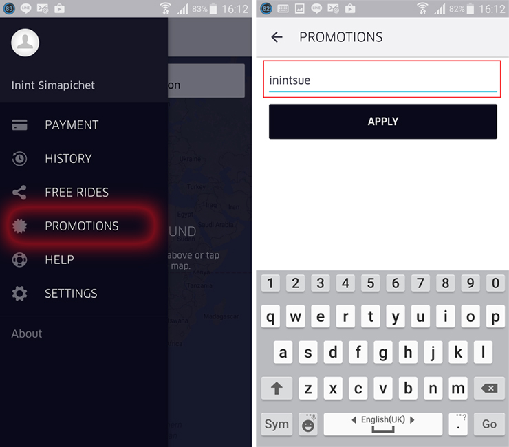 หลังจากเปิดแอพแล้ว กรอกรหัสรับ Free Ride นั่งรถฟรีก่อน 300 บาท โดยกด Promotions แล้วใส่รหัส “ inintsue “ แล้วกด Apply ง่ายๆแค่นี้ก็นั่งฟรี 300 บาทแล้วครับ