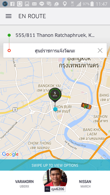 พอมีคนขับรับงานแล้ว แอพก็จะบอกเลยว่าคนขับชื่ออะไร ทะเบียนอะไร รถยี่ห้ออะไรรุ่นอะไร และรถจะมารับในอีกกี่นาที