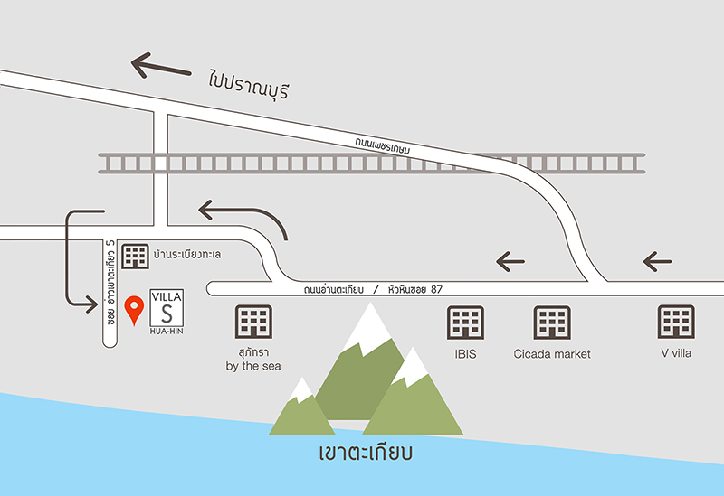 Villa-S ที่พักเขาตะเกียบ หัวหิน ถ้ามาจากตัวเมืองหัวหินก็ตรงเข้าเขาตะเกียบมาเลย พอเจอวงเวียนก็เลี้ยวมาทางออกที่ 2 ตรงมาอีกหน่อย สังเกตุบ้านระเบียงทะเลก็เลี้ยวเข้าซอยเลยครับ