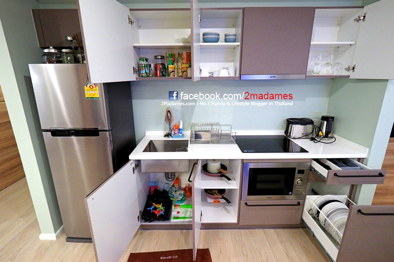 ชุดครัวแบบอุปกรณ์จัดเต็ม ตู้เย็น เตาไฟฟ้า เตาอบ เครื่องปิ้งขนมปัง กาต้มน้ำร้อน จานชามช้อนส้อมทุกอย่าง (มีเยอะกว่าบ้านผมอีก)