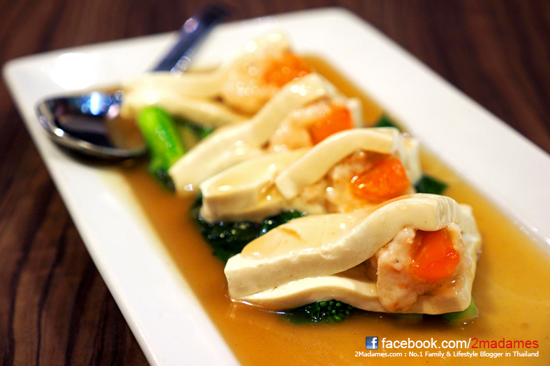 ผมสั่งเต้าหู้ยัดไส้ไข่เค็ม เต้าหู้ที่ใช้เป็นเต้าหู้อ่อนญี่ปุ่น นุ่มเนียน และกลิ่นไม่แรง สอดไส้มาด้วยกุ้งสับและไข่เค็มแดงสด ที่ให้รสชาติเค็มนิดๆมันหน่อยๆ เสิร์ฟมาบนคะน้าฮ่องกงลวกมากรอบๆ แล้วราดน้ำแดงรสชาติที่รสชาติกลมกล่อมไม่เค็มจนเกินไป เด็กๆบอกว่าอร่อยเลยครับ ตักทานเปล่าๆไปต้องราดข้าวได้เลย จานนี้ 170 บาท