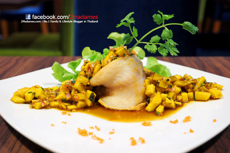 ปลาดอรี่แมงโก้ซัลซ่า ต้องบอกเลยว่าแปลกแต่อร่อย ตรงน้ำราดนี่แหละ ปกติจะเจอน้ำราดมะม่วงที่ออกไปในแนวเปรี้ยวๆอมหวานๆ แต่เมนูนี้มีรสเค็มจากซอส แถมหอมหวานจากมะม่วงสุก ส่วนเนื้อปลาที่เห็นม้วนๆอยู่นั้นใช้วิธีการกริลล์ให้สุก จึงได้รสชาติที่หอม หวาน มัน เค็ม จานนี้ 180 บาท