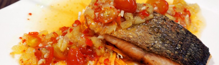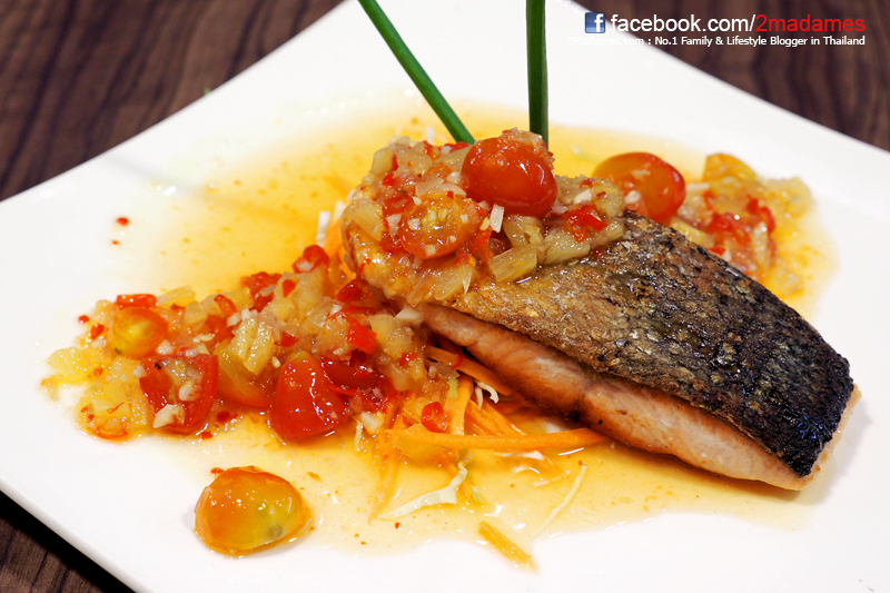 ปลาเมนูถัดมาก็ยังน่าสนใจอีกไม่น้อย แซลมอนราดพริกสามรส ตอนสั่งยอมรับเลยว่านึกว่าเหมือนปลาสามรสทั่วๆไปที่เน้นราดพริกกระเทียมมาตูมๆ แล้วปรุงรสชาติที่น้ำราดเอา แต่ตอนน้องพนักงานยกมาเสิร์ฟ เห็นแล้วต้องบอกว่าเก๋มากครับ ที่ทางร้านใช้การดึงรสชาติของผลไม้ประจำท้องถิ่นมาทำให้เมนูนี้ดูน่าสนใจมากยิ่งขึ้น ด้วยการใช้สับปะรดสับที่ให้รสชาติหวาน และมะเขือเทศราชินีผ่าซีก ที่ให้รสชาติอมเปรี้ยวเล็กๆ นำมาผัดรวนกับหอมแดงและกระเทียมสับ จนให้ผลไม้ทั้งสองอย่างคายน้ำออกมา จึงได้น้ำราดสามรสสุดครีเอทอย่างที่เห็นกันครับ จานนี้ 220 บาท