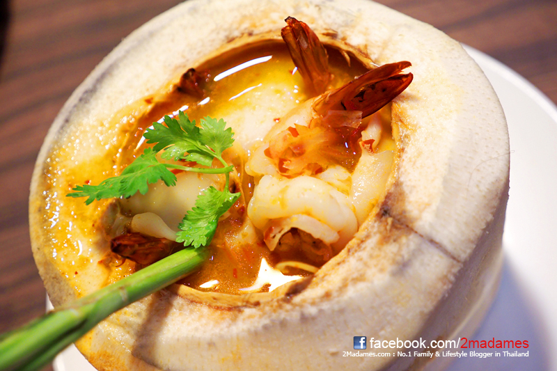 ตัดเลี่ยนจากเมนูปลาๆ มาซดน้ำแกงให้คล่องคอกันบ้างนะครับ ต้มยำในลูกมะพร้าว ตอนแรกบอกเลยว่าดูธรรมดามากๆ แต่พอตักชิมแล้วบอกได้เลยว่าห้ามพลาดเมนูนี้ด้วยประการทั้งปวงนะครับ ต้มยำถ้วยนี้มีดีที่ใช้น้ำมะพร้าวอ่อนๆแทนน้ำสต๊อก เลยทำให้น้ำแกงมีรสชาติหวานหอม อาจไม่ถูกใจเพื่อนๆที่ชอบทานรสชาติจัดจ้านสักเท่าไหร่นะครับ แต่บอกเลยว่ารสชาติกลมกล่อมมากๆ ซุปในมะพร้าวลูกนี้ 180 บาทครับ