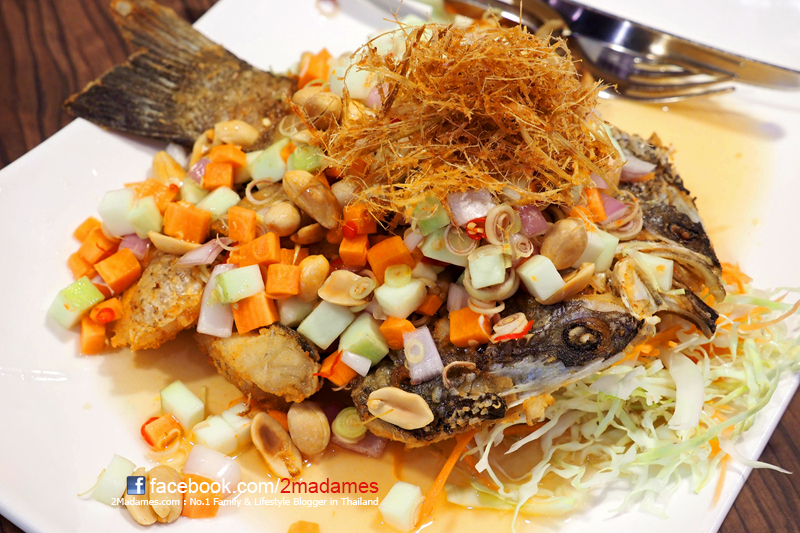 ปลากะพงทอดสมุนไพร เป็นเมนูเน้นสุขภาพอีกจานเลยก็ว่าได้ครับ เมนูนี้จะแล่ปลาเป็นชิ้นพอดีคำ ทอดกรอบกำลังดี ราดด้วยน้ำยำคลุกเครื่องเคียงสมุนไพร อย่างตะไคร้ ขิง และผักเพิ่มสีสันอย่างแครอท และใส่แอ็ปเปิ้ลเขียวช่วยเพิ่มความเปรียวแทนมะนาวด้วย จานนี้ 300 บาทครับ