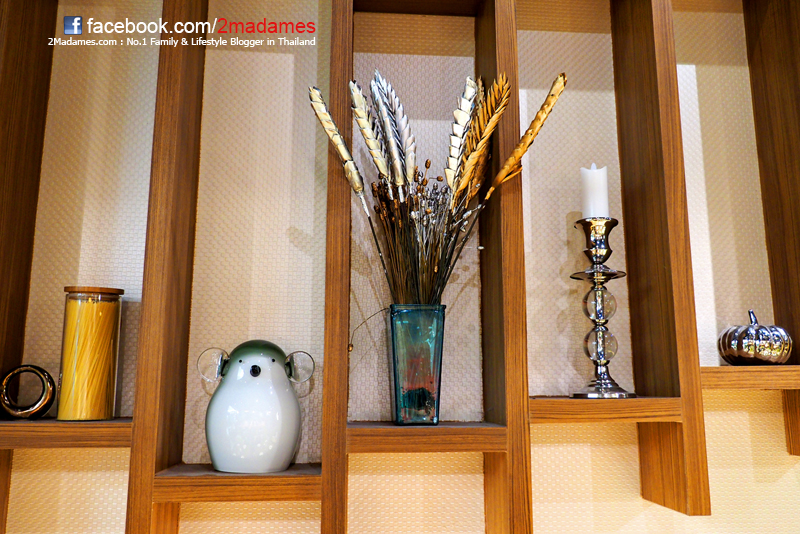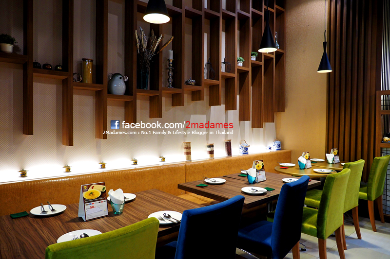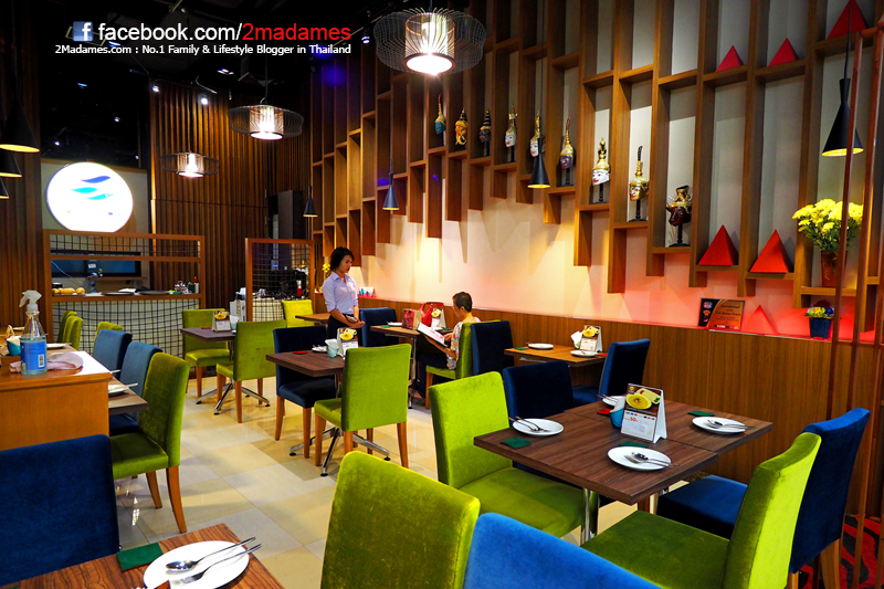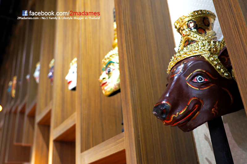 บรรยากาศร้านออกแนวโมเดิร์น ที่เน้นสีสันสดใส ให้ร้านดูมีชีวิตชีวา แถมเพิ่มกลิ่นอายของความเป็นไทยฟากหนึ่งด้วย หัวโขนประดิษฐ์