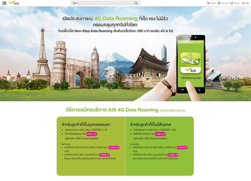 ล่าสุดมีบริการ AIS 4G Roaming (LTE) ครอบคลุมมากที่สุดทุกทวีปทั่วโลก พร้อมแพ็กเกจ Non-Stop Data Roaming ราคาเบาๆ เริ่มต้นเพียง 280 บาท/ วัน โดยแพ็กเดียวสามารถใช้ได้ในหลายประเทศ และใช้ได้เต็ม 24 ชั่วโมง ไม่ต้องกลัวบิลช็อกด้วย ถือเป็นอีกทางเลือกในการใช้อินเตอร์เน็ตต่างแดนเลยครับ