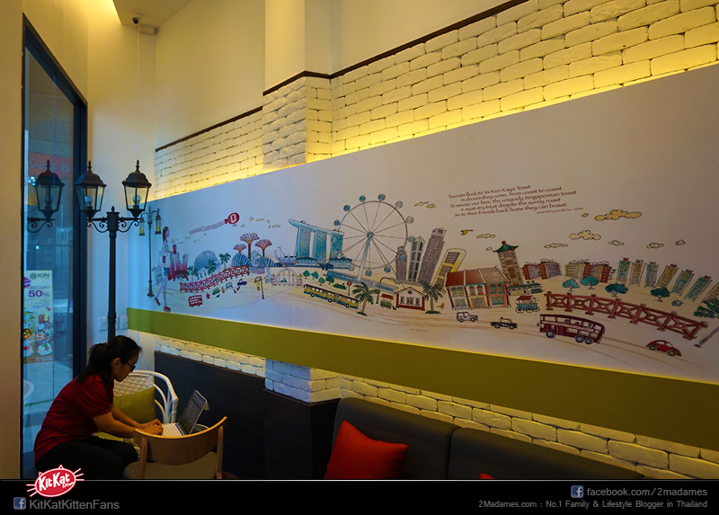เข้ามาแล้วก็หาที่นั่งกันก่อนเลยค่ะ เหมียวๆแอบมองมุมนี้ไว้ค่ะ เห็นภาพที่ผนังที่คาดว่าทางร้านคงอยากให้คิดถึงเรื่องราว และสถานที่เที่ยวที่สิงคโปร์ ทั้งในร้านเองก็มีทีวีที่เปิดบรรยายเรื่องราวความเป็นมาของร้านค่ะ