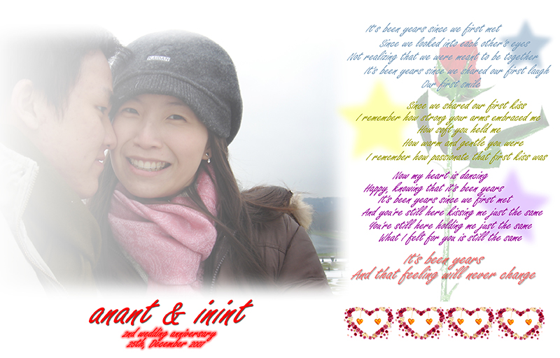 วันที่ผมขอแอนแต่งงาน ผมขับรถไปรับแอนที่ทำงาน ตอนนั้นเกือบจะสี่ทุ่มแล้ว ตลอดทางเราสองคนก็พูดคุยกันปกติ พอถึงบ้านแอนแล้ว ผมพูดกับเธอสั้นๆ “แอน เราแต่งงานกันนะ” แอนนิ่งอยู่สักครู่ ไม่มีเสียงตอบใดๆจากเธอ มีเพียงน้ำตาลูกผู้หญิงคนหนึ่ง และอ้อมกอดจากเธอเป็นคำตอบ…