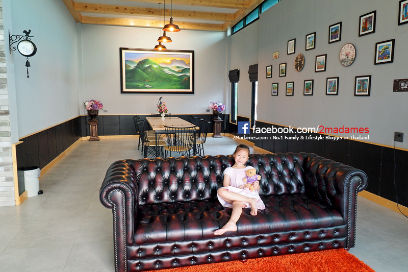 ตรงกลางบ้านจะเป็นพื้นที่กว้างๆ มีโซฟา Vintage ให้นั่งเล่น ส่วนด้านกลางจะเป็นโต๊ะทานอาหารครับ