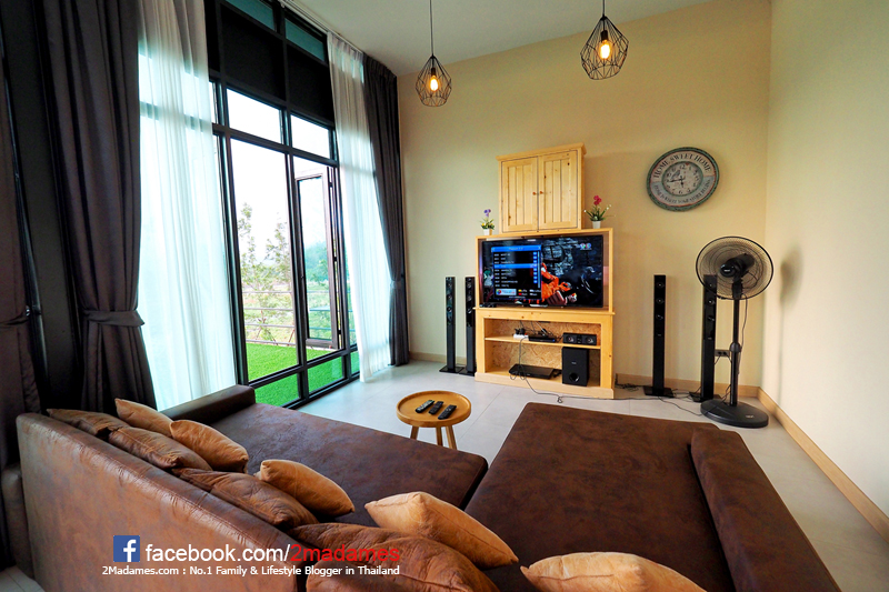 มาชมภายในตัวบ้านกันนะครับ เริ่มจากโซนแรกเลย เป็นโซฟานั่งเล่น พร้อมทีวีและเครื่องเสียง มีเคเบิ้ลทีวีให้ชมด้วย