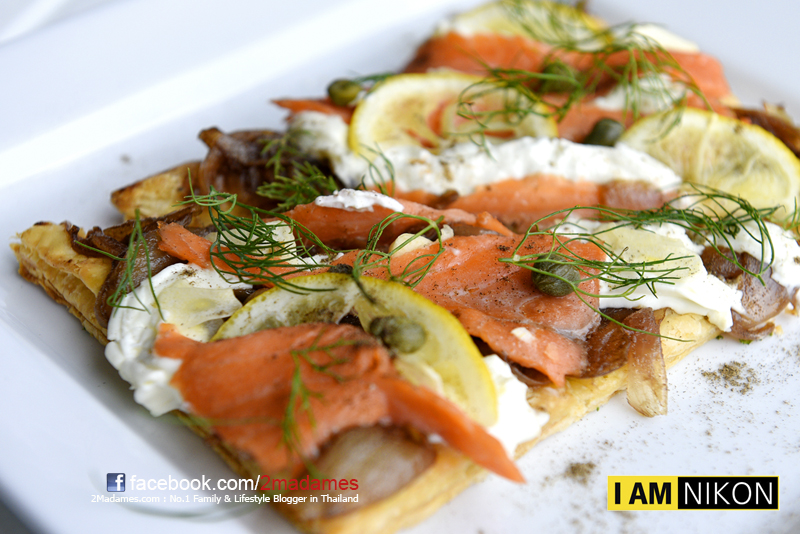 เริ่มต้นด้วย แซลมอนรมควันเสิร์ฟพร้อมกับมะนาว ครีมชีส และหัวหอมผัดซอสบัลซามิก
